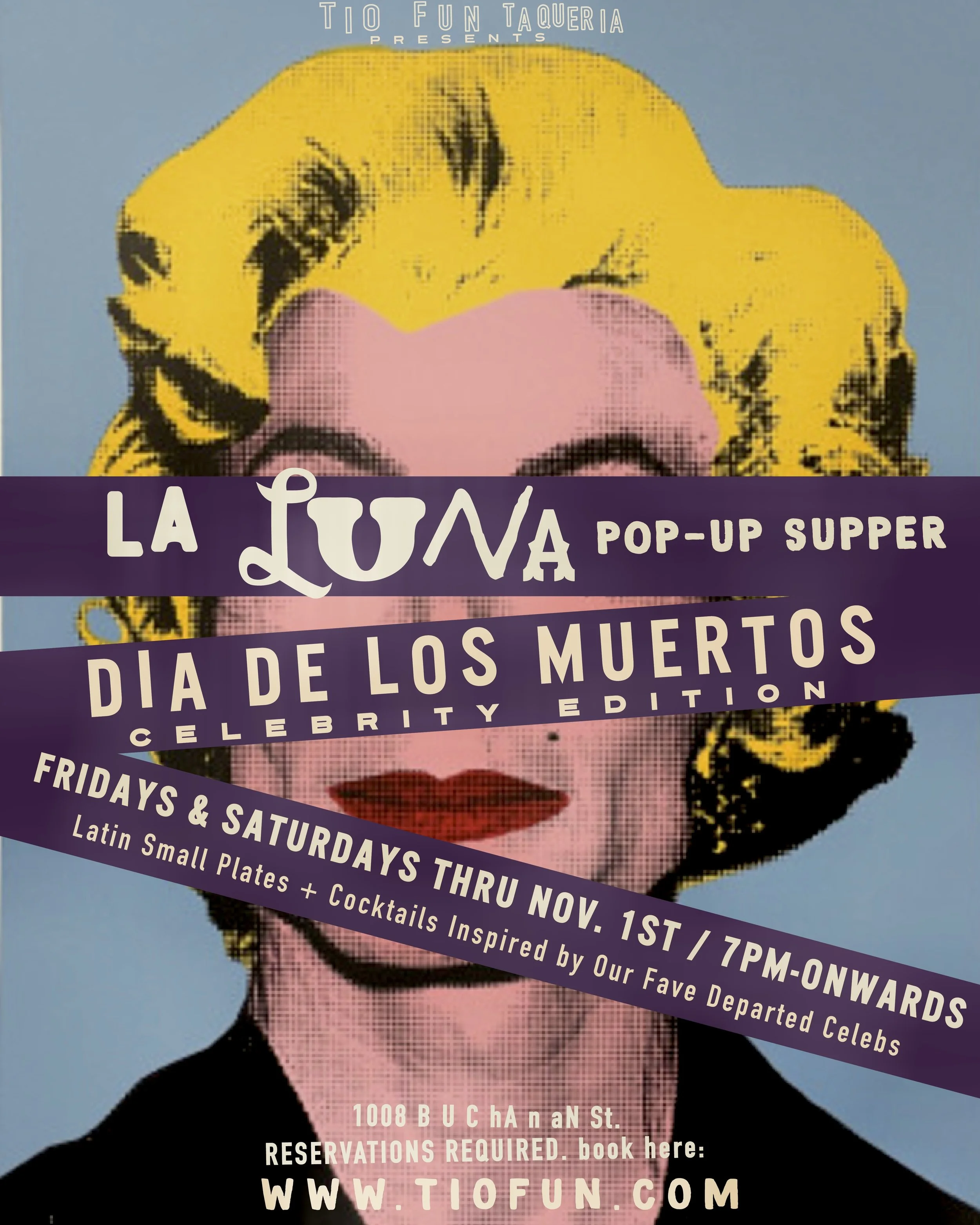 Only on Friday and Saturday nights until November 1st, our cozy taqueria will slip into its moonlit alter ego, becoming a twinkling hideaway for inventive Latin-inspired small plates with an orbit of playful cocktails, mocktails, and curated wines. We’re dusting off our clandestine culinary roots, sprinkling in some lunar magic, and inviting Nashville to gather beneath La Luna’s spell - where plates hum with sabor, drinks bring a playful wink, and the evening feels like a charming secret passed around the table. The theme of these suppers is Dia De Los Muertos, celebrity edition. Each dish on the menu is influenced from some of our fave departed celebrities!